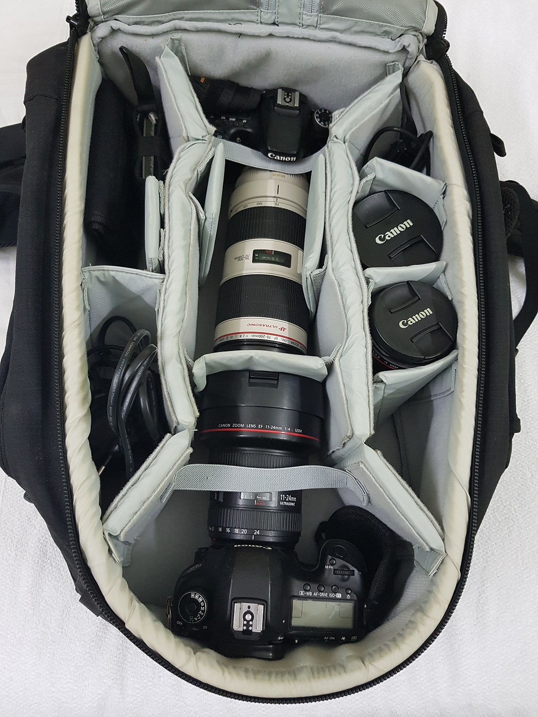 This particular model is specifically designed for those individuals who are destined to carry two or more full frame camera bodies along with with one telephoto lens attached. This bag can carry that combination and also accommodate a few more wide bodies lenses in addition to plethora of accessories. In terms of lenses I would say the following combination is easily possible