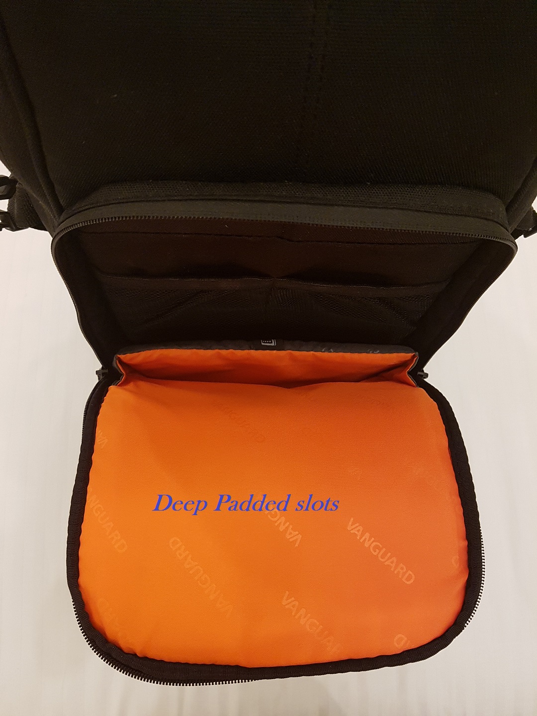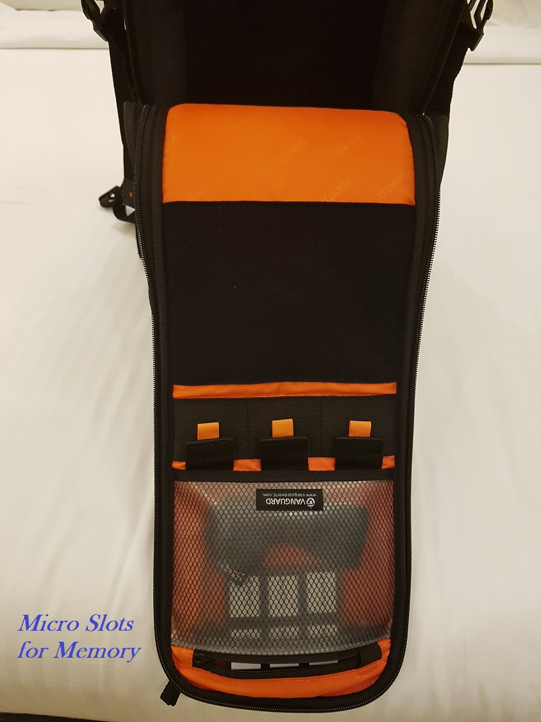 The first thing that one notices when the main compartment is opened is the amount of padding provided, it is everywhere. The main central flap opens to a very large extent to provide space and ease of movement in putting and removing the lens. Also the main flap features on the inner side three micro slots for stashing memory cards.