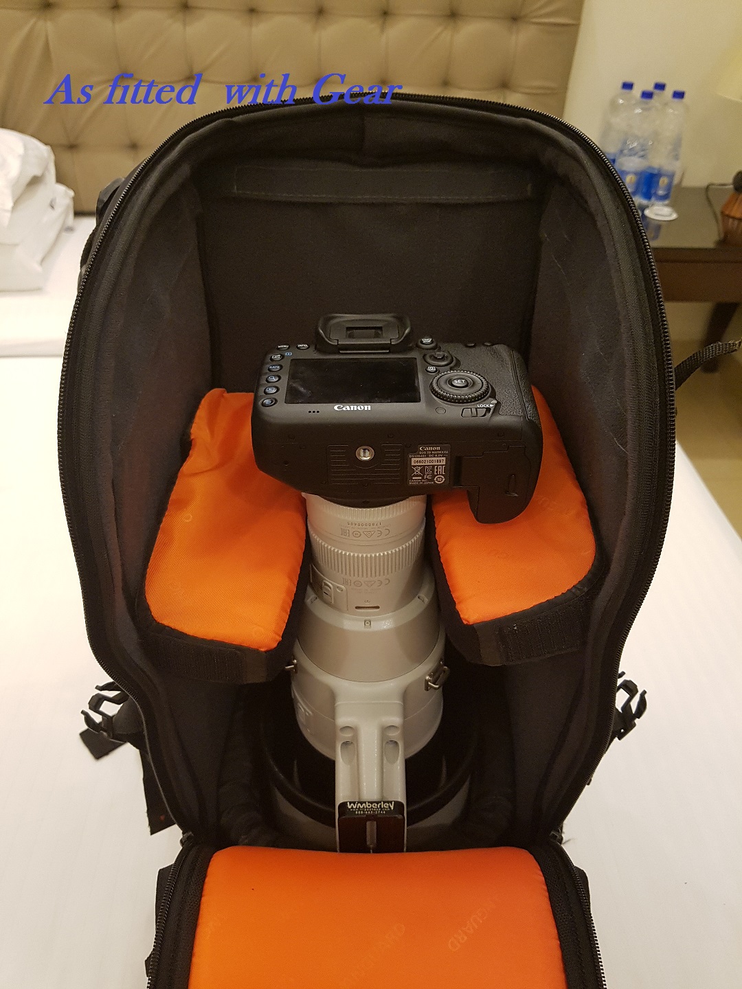 An adjustable thick sturdy well-padded cradle supports the camera body from below and secures the large lens in position, while making sure that it is well protected all around .The lens is held in place with a large U shaped pad that travels up and down. This pad is again Velcro based and height adjustable. Small Velcro tabs hook everything in place.